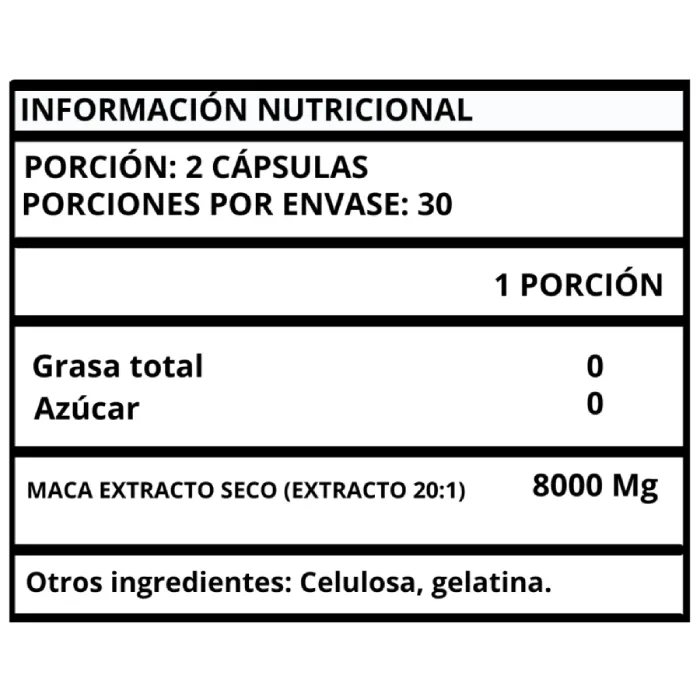 Nombre: Maca Extracto Seco (Extracto Concentrado 20:1). Potencia: Equivalente a 8000 mg por dosis diaria. Presentación: Frasco de 60 Cápsulas (te rinde para 1 mes completo).