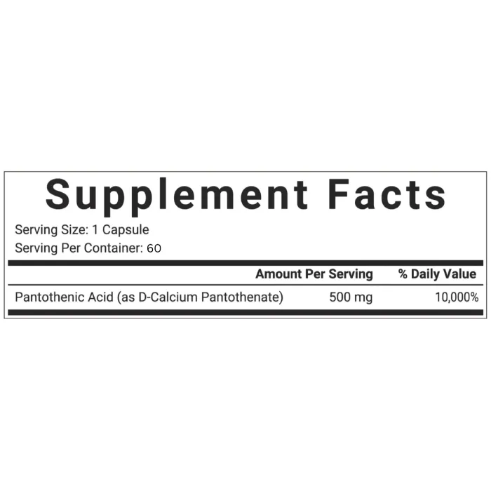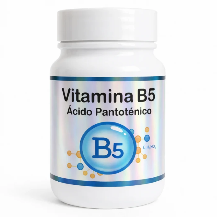 Nombre: Vitamina B5 (Ácido Pantoténico). Potencia: 500 mg por cápsula (Alta Potencia). Presentación: Frasco de 60 Cápsulas (Tratamiento para 2 meses).